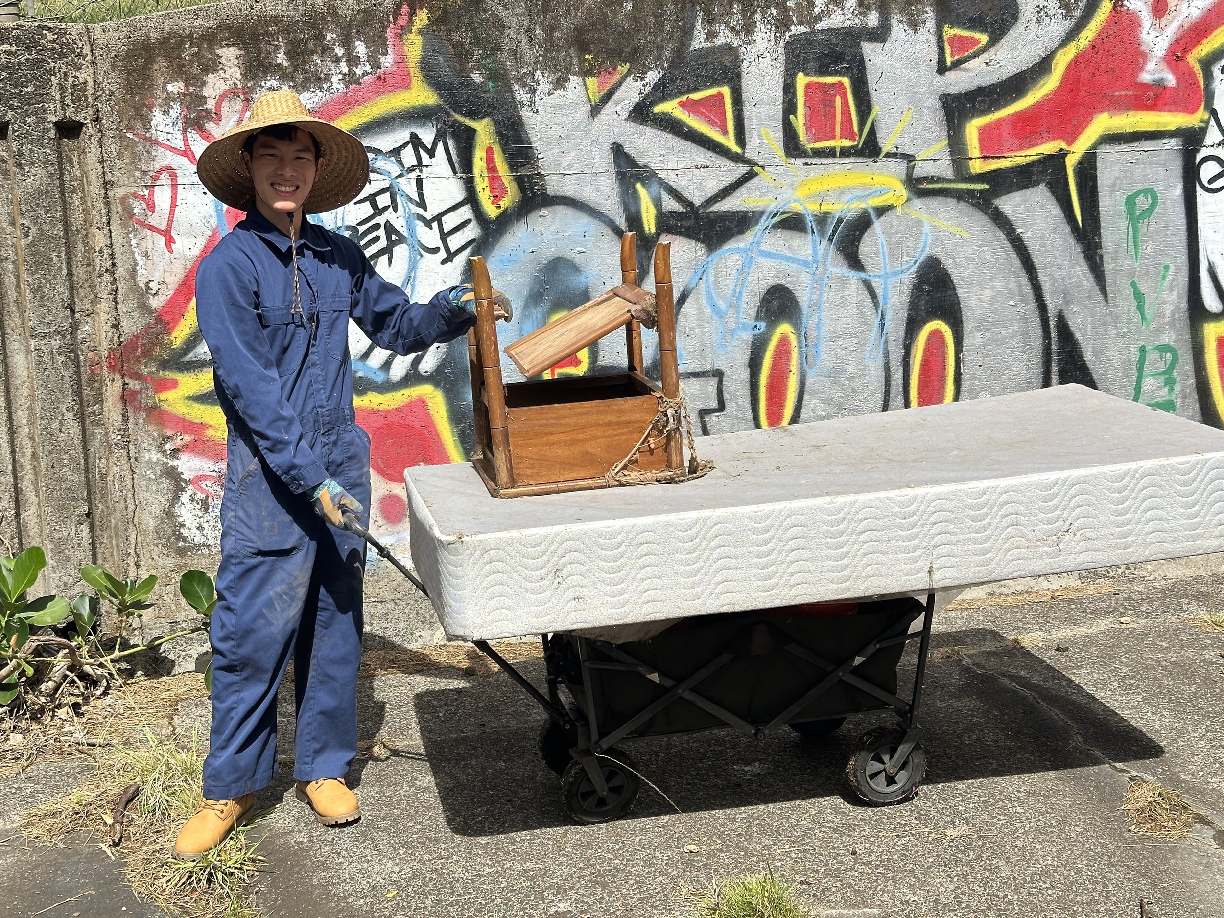 Jackson cleaning up trash along the streambed in Palolo Valley.